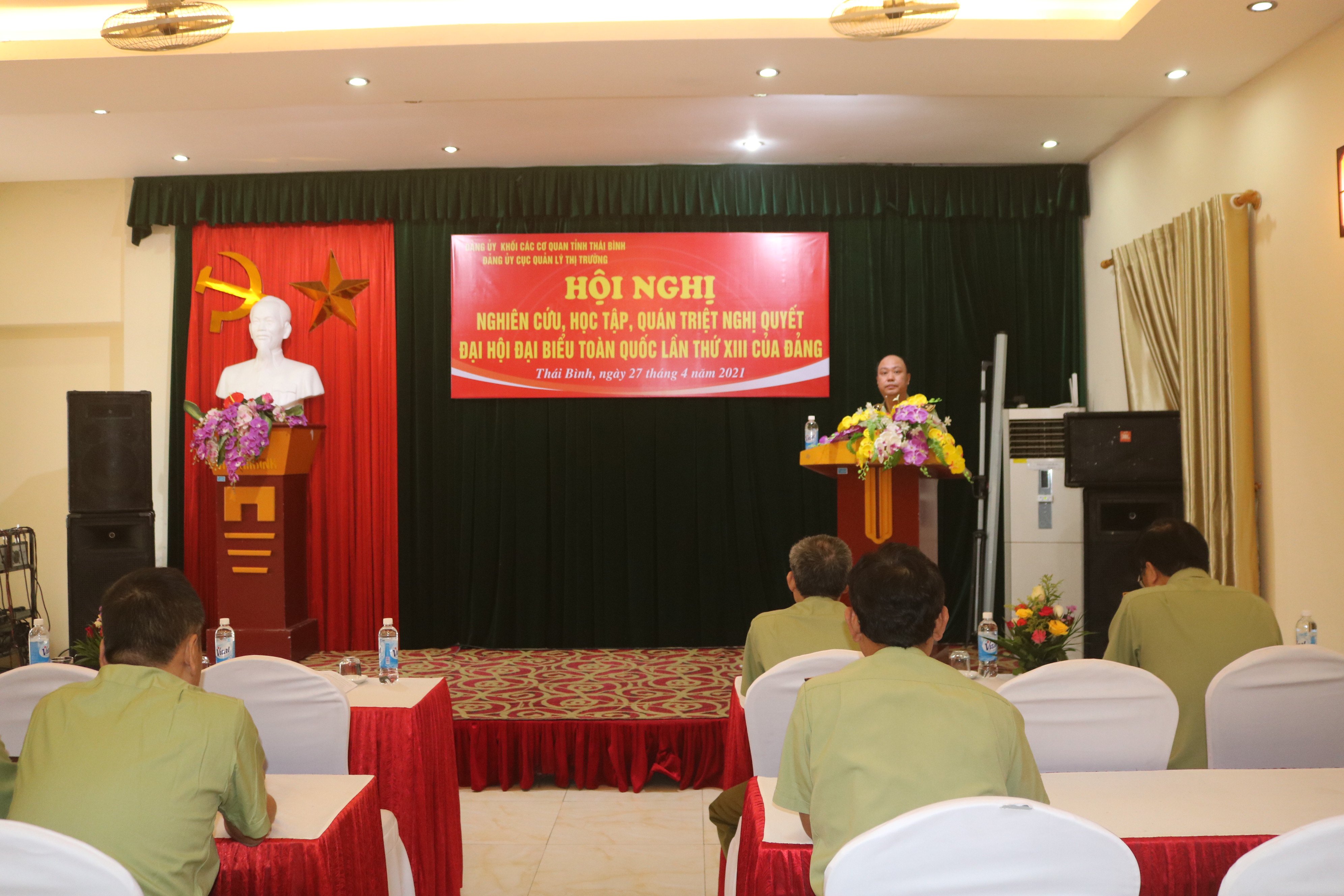 Thực hiện Kế hoạch số 11-KH/ĐUK ngày 25-3-2021 của Ban Thường vụ Đảng uỷ Khối các cơ quan tỉnh và Kế hoạch số 03-KH/ĐU ngày 02-4-2021 của Đảng uỷ Cục QLTT Thái Bình. Cục QLTT đã tổ chức Hội nghị nghiên cứu, học tập, quán triệt Nghị quyết Đại hội đại biểu toàn quốc lần thứ XIII của Đảng. Tại Hội nghị, toàn thể các cán bộ, Đảng viên, công chức và người lao động đã được nghe đồng chí Vũ Văn Phóng - Trưởng ban Tuyên giáo Đoàn thể Đảng ủy khối cơ quan tỉnh, Báo cáo viên cấp tỉnh truyền đạt những nội dung cơ bản về nghiên cứu, học tập, quán triệt, tuyên truyền và triển khai thực hiện Nghị quyết Đại hội đại biểu toàn quốc lần thứ XIII của Đảng.